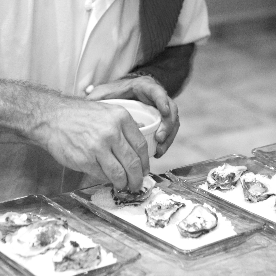 SMOKED AND GRILLED OYSTERS WITH SALSA VERDE, PORK BELLY CICHARON, COTILLA CHEESE AND AVOCADO PURÉE.