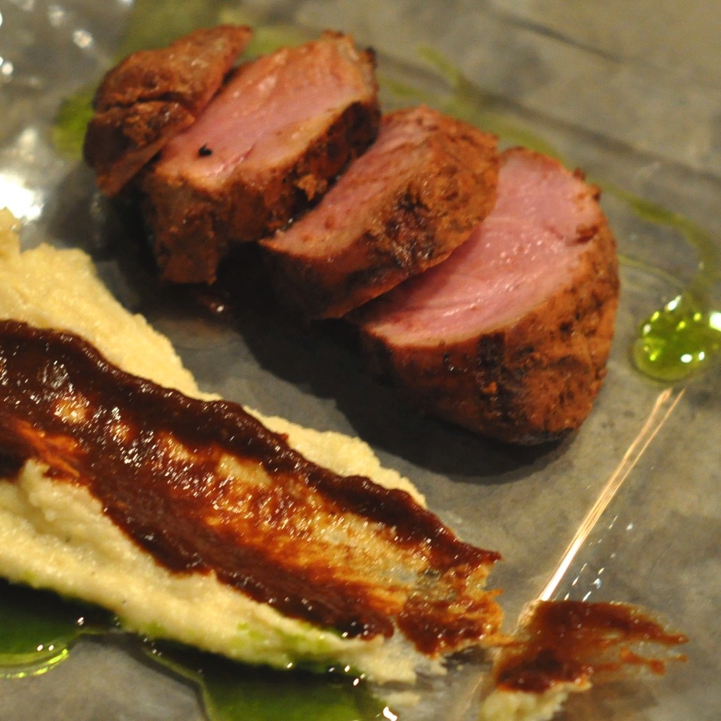DECONSTRUCTED TACOS AL PASTOR. ADOBO RUBBED PORK TENDERLOIN WITH GRILLED POLENTA CAKE AND CILANTRO OIL.