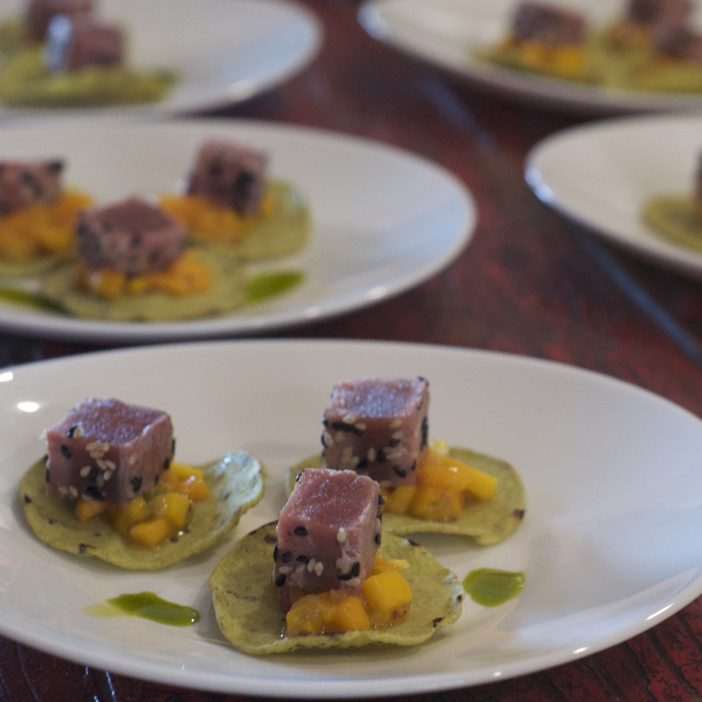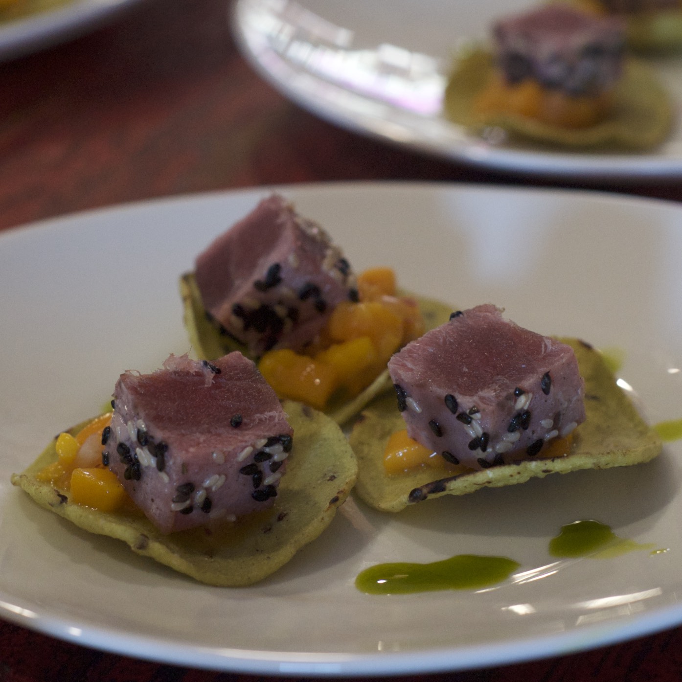 1ST COURSE: SESAME SEARED TUNA TOSTADITAS WITH MANGO, RED ONION AND LIME CHUTNEY.