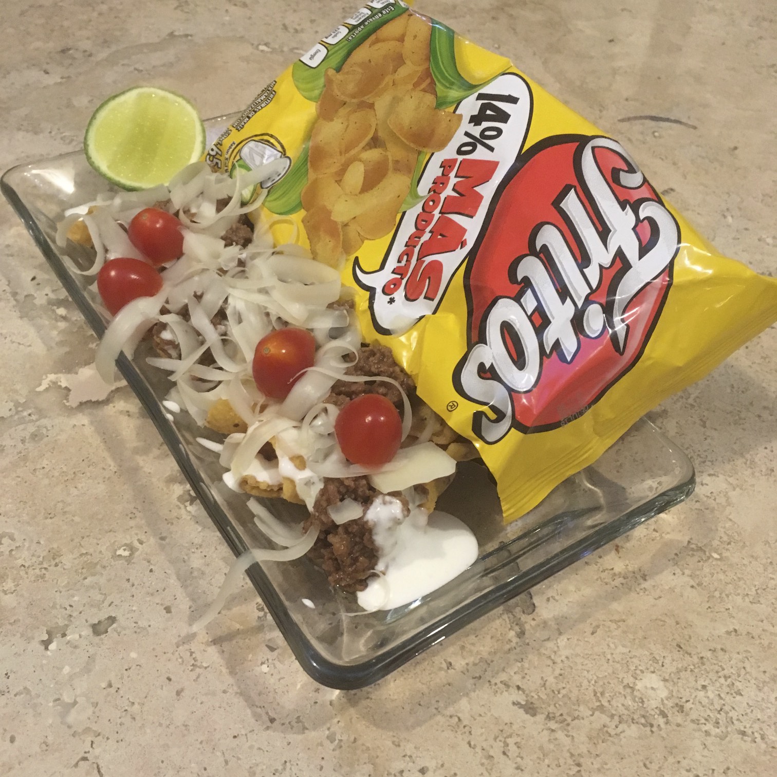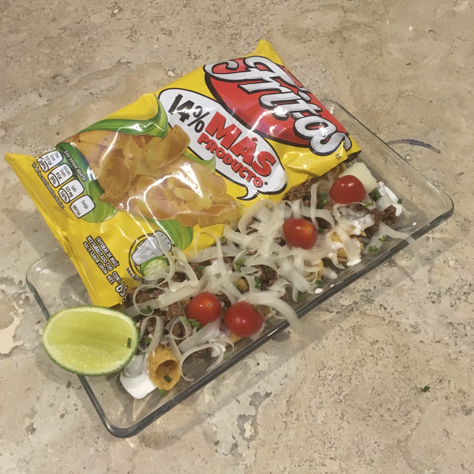 THESE TACOS START WITH A BASE OF CORN CHIPS AND A TEX-MEX STYLE GROUND BEEF AS THE BASE. KIND OF SIMILAR TO A FRITO PIE. THEN COME THE TOPPINGS!