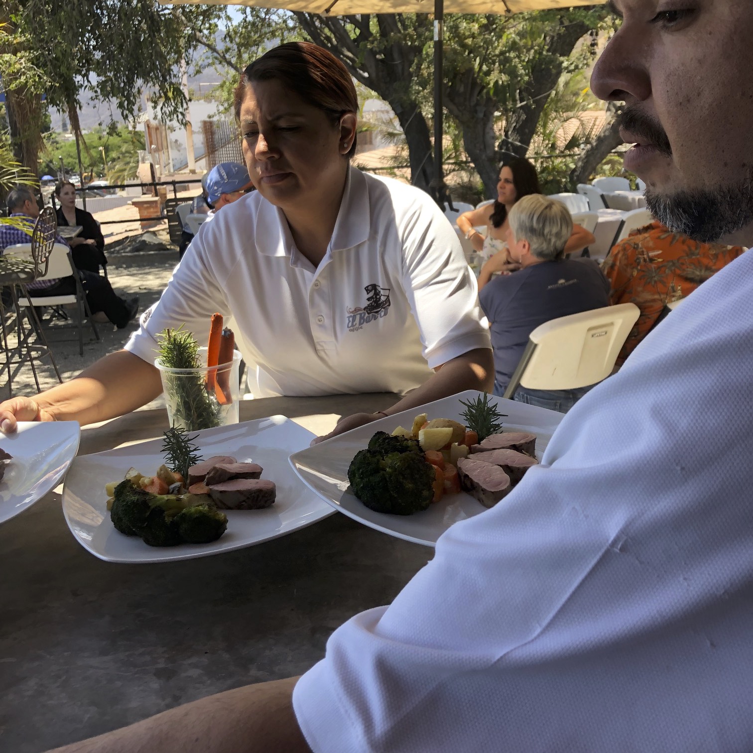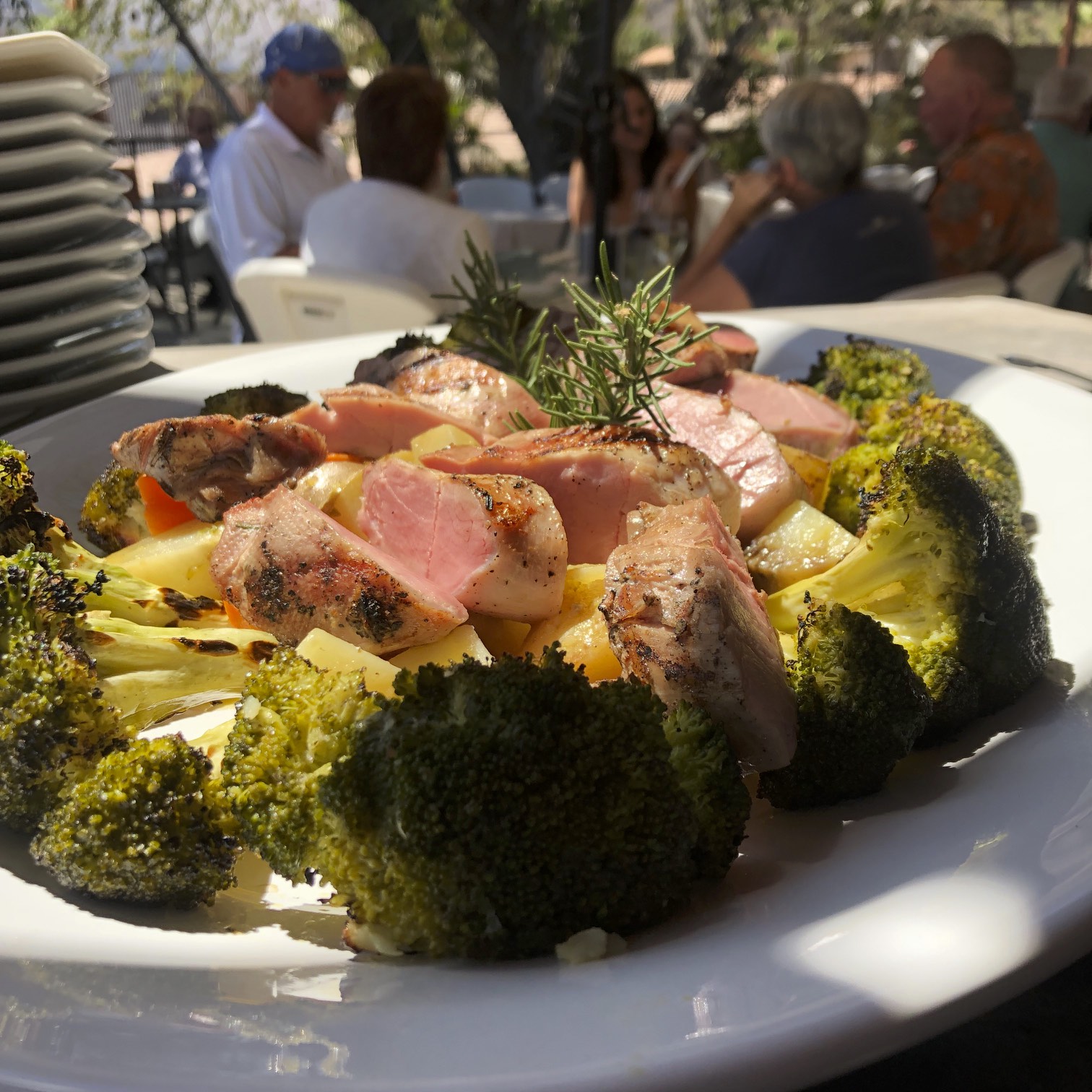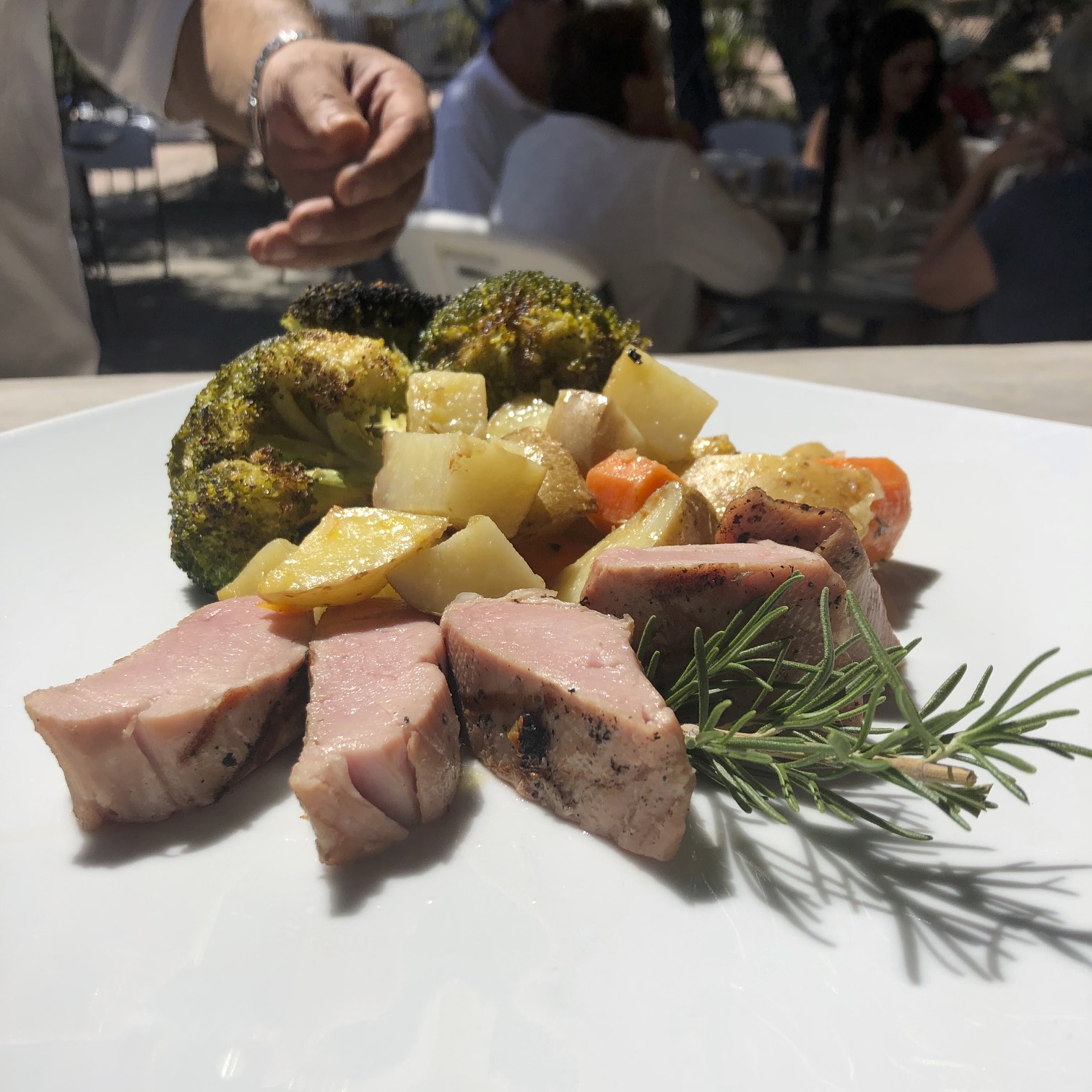 ROSEMARY PORK TENDERLOIN, (SOUS VIDE AND GRILLED), ALONGSIDE ROASTED ROOT VEGGIES AND CHARRED PARMESAN BROCCOLI.