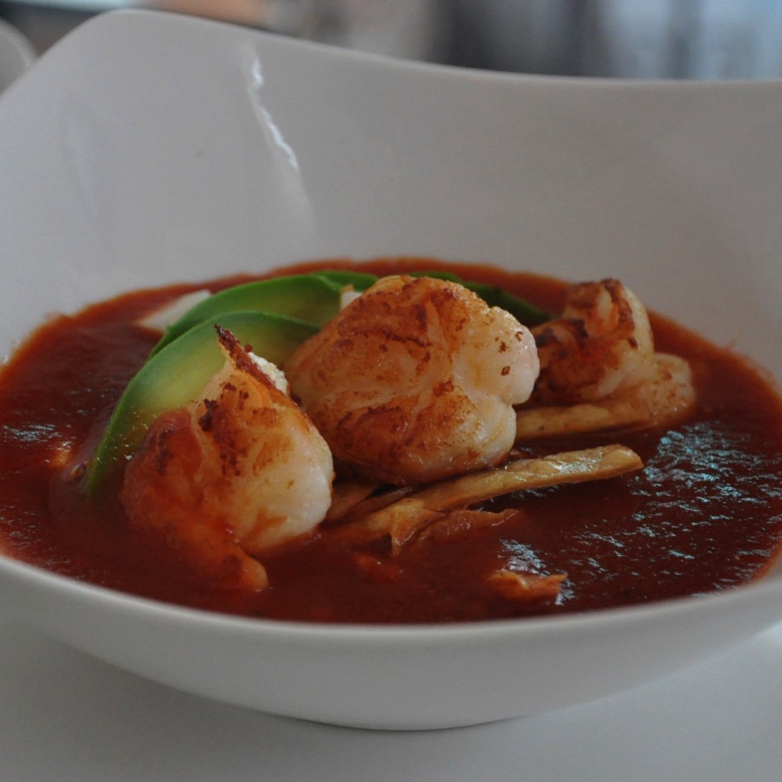 BUTTER SOUS VIDE PACIFIC COAST MEXICAN SHRIMP, SHELLFISH AND TOMATO DASHI, AVOCADO, PANELA CHEESE AND CRISPY FRIED CORN TORTILLA ROUNDS.
