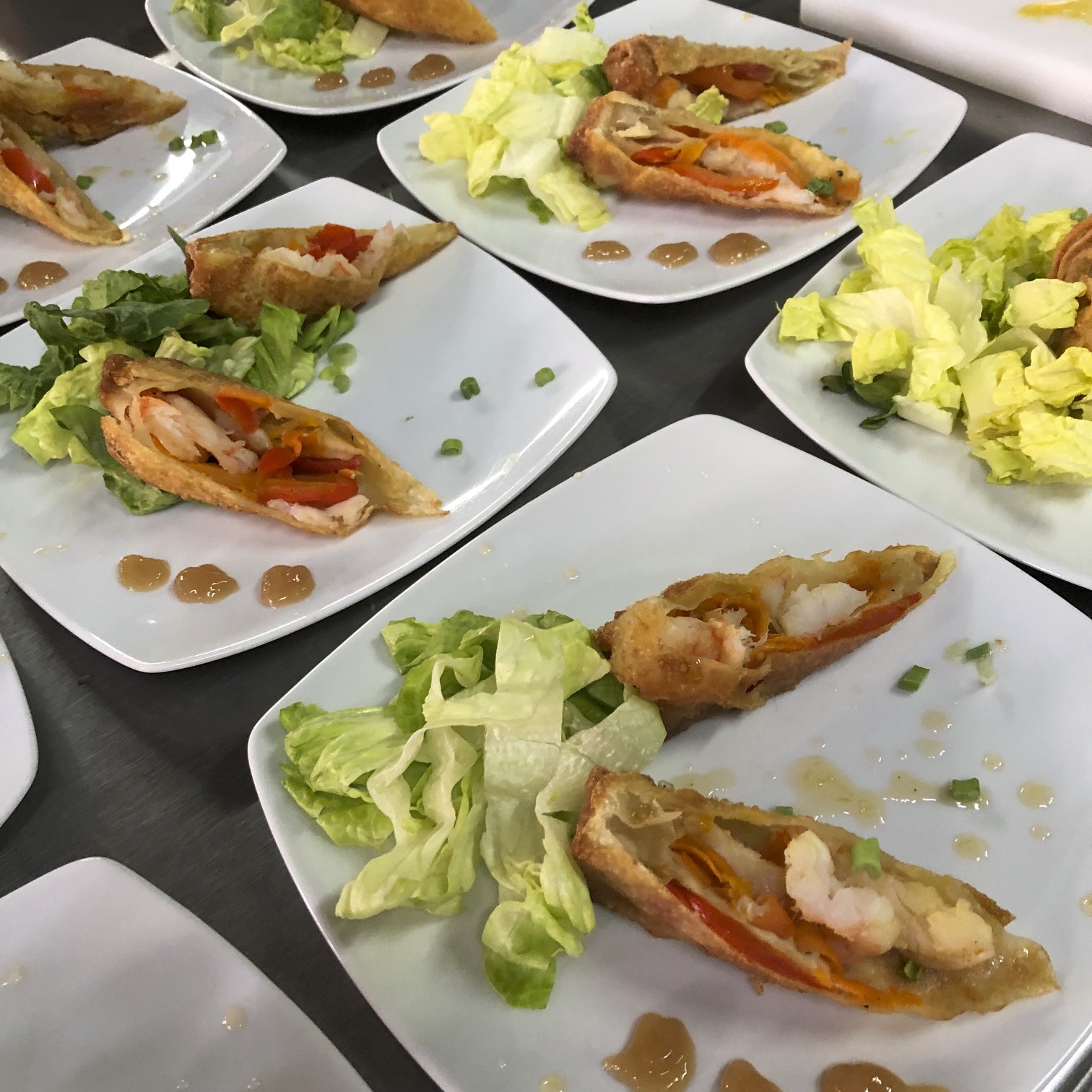 MEXICAN GULF SHRIMP, CARROT, RED BELL PEPPER EGG ROLLS WITH A HONEY AND GINGER GLAZE.