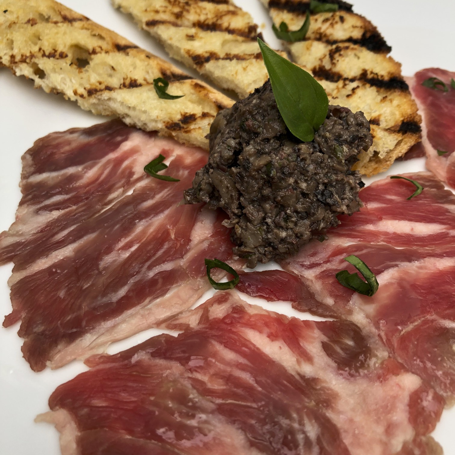 THIN SLICES OF USDA PRIME RIB WITH PORTOBELLO TAPENADE, MICRO GREENS AND A ROSEMARY VINAIGRETTE