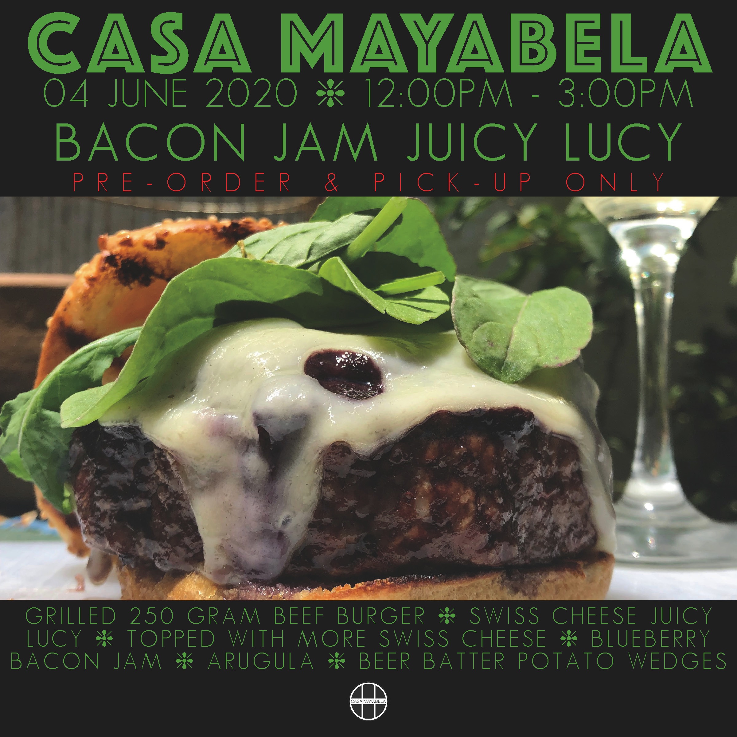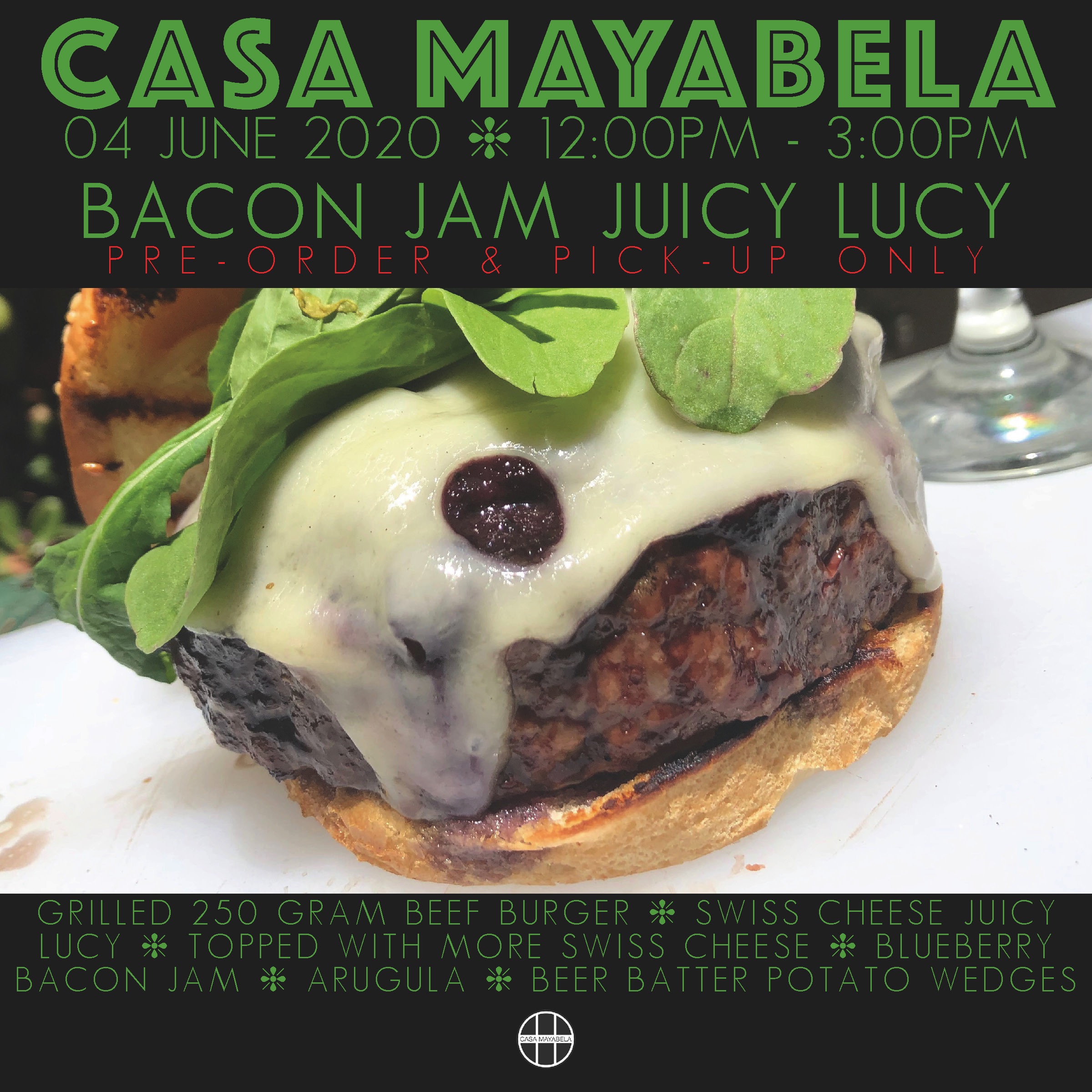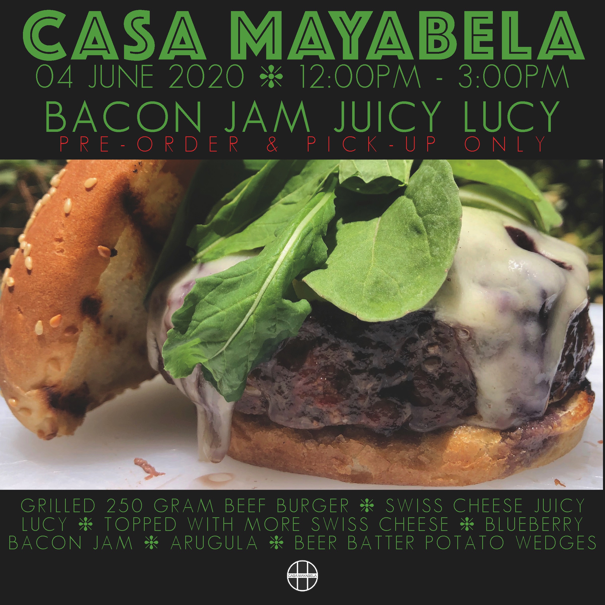 GRILLED 250 GRAM BEEF BURGER ❈ SWISS CHEESE JUICY LUCY ❈ TOPPED WITH MORE SWISS CHEESE & BLUEBERRY BACON JAM ❈ ARUGULA ❈BEER BATTER POTATO WEDGES❈200 pesos