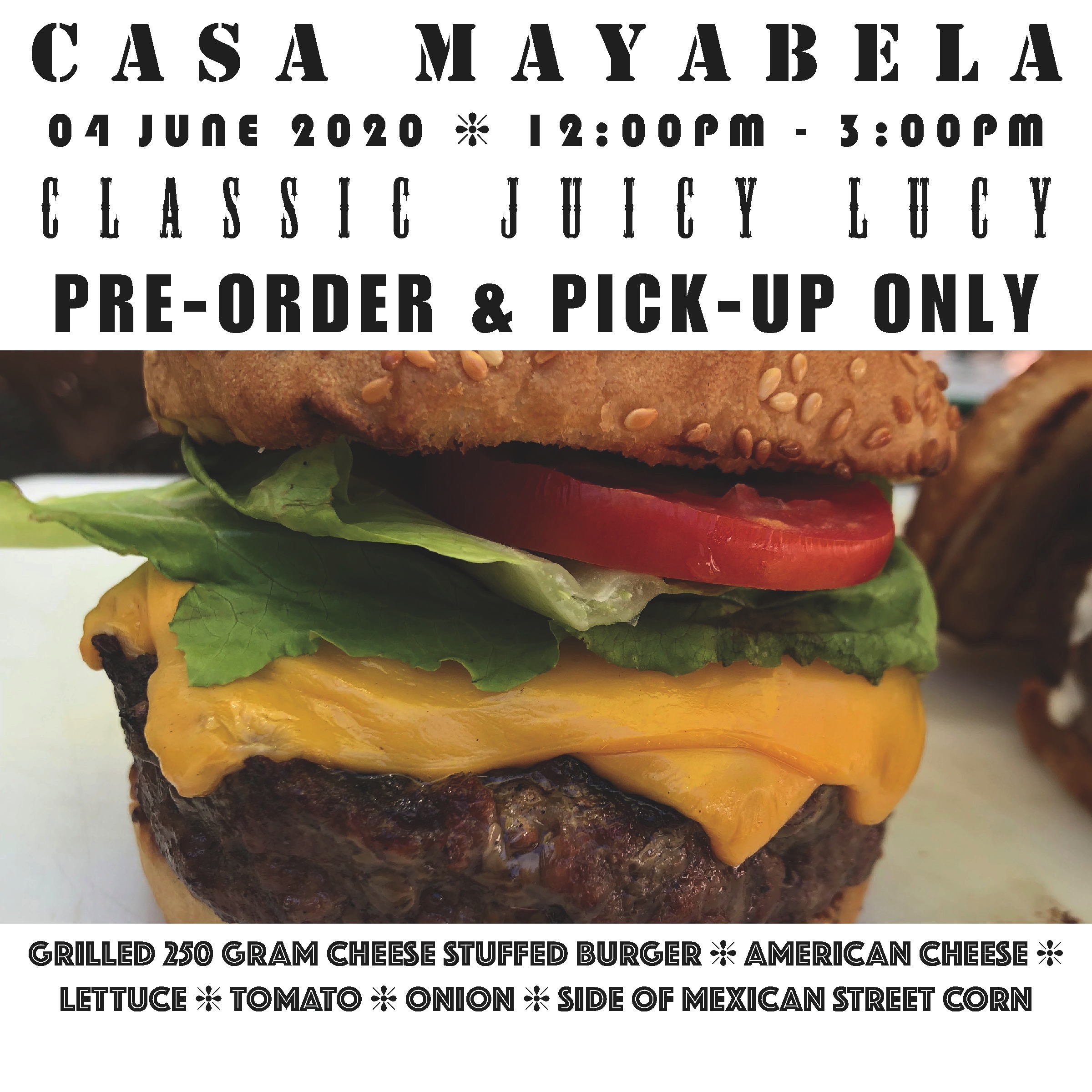 GRILLED 250 GRAM CHEESE STUFFED JJUICY LUCY ❈ LETTUCE ❈ TOMATO ❈ ONION ❈ BEER BATTER POTATO WEDGES ❈ 175 PESOS