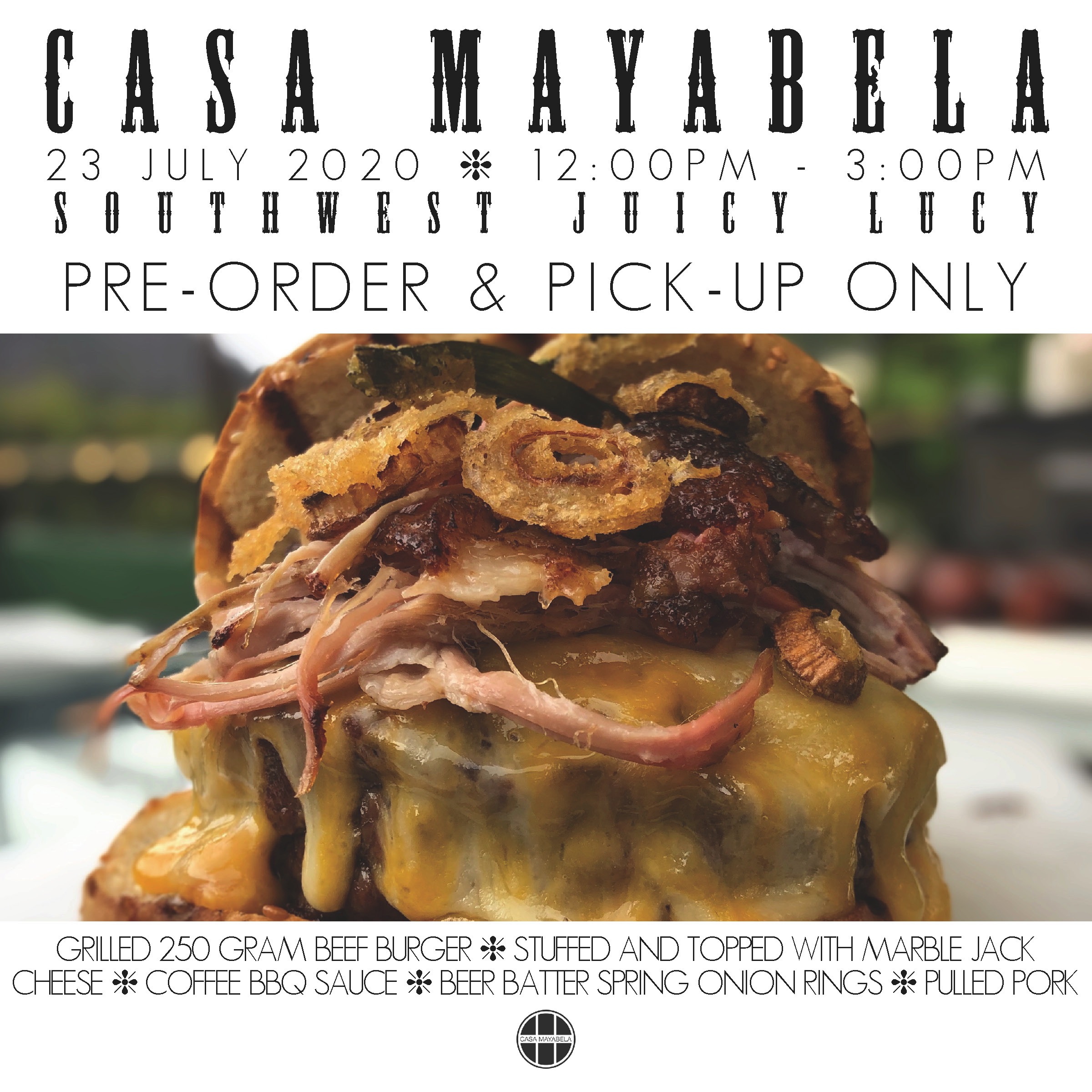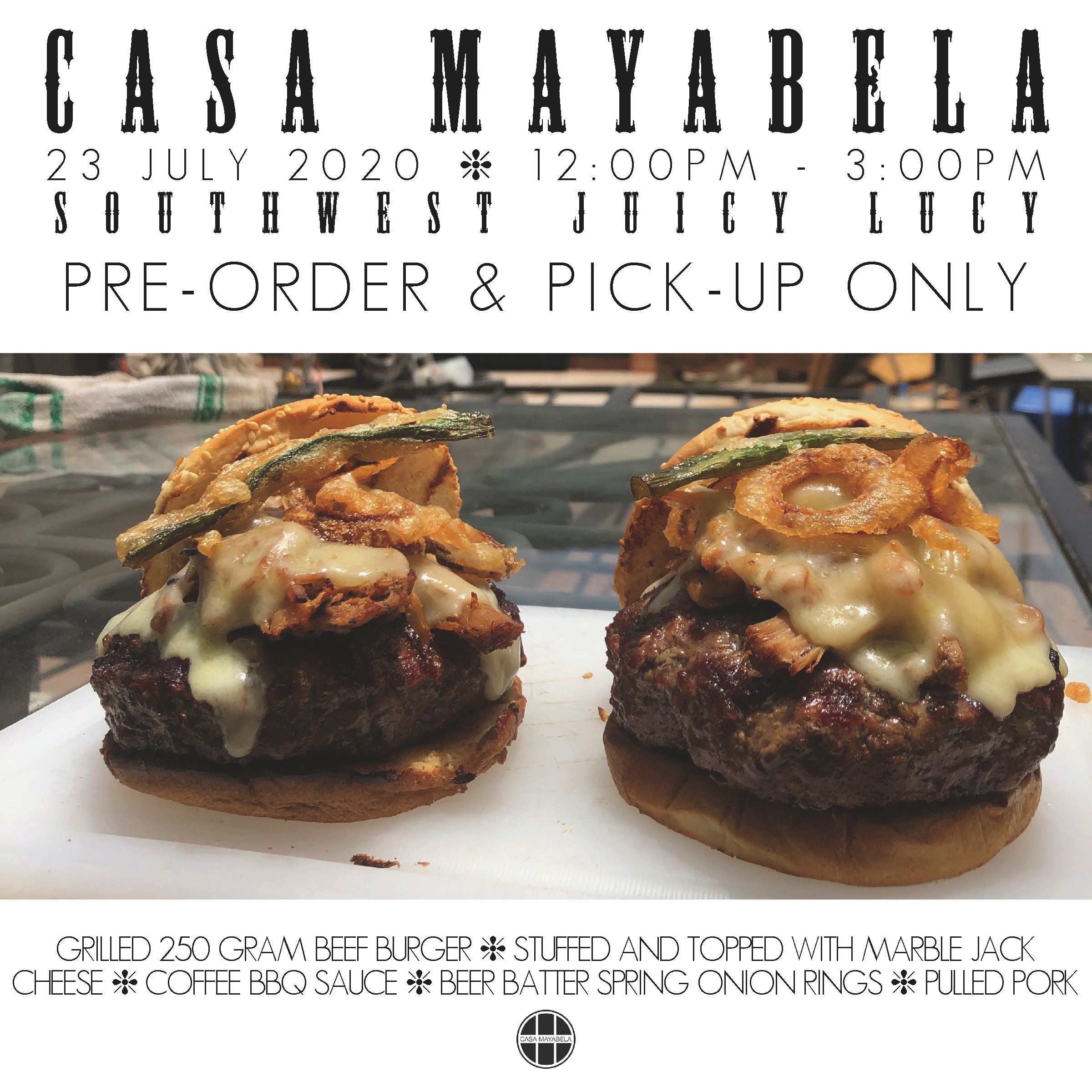 GRILLED 250 GRAM BEEF BURGER ❈ STUFFED AND TOPPED WITH MARBLE JACK CHEESE ❈ COFFEE BBQ SAUCE ❈ BEER BATTER SPRING ONION RINGS ❈ PULLED PORK