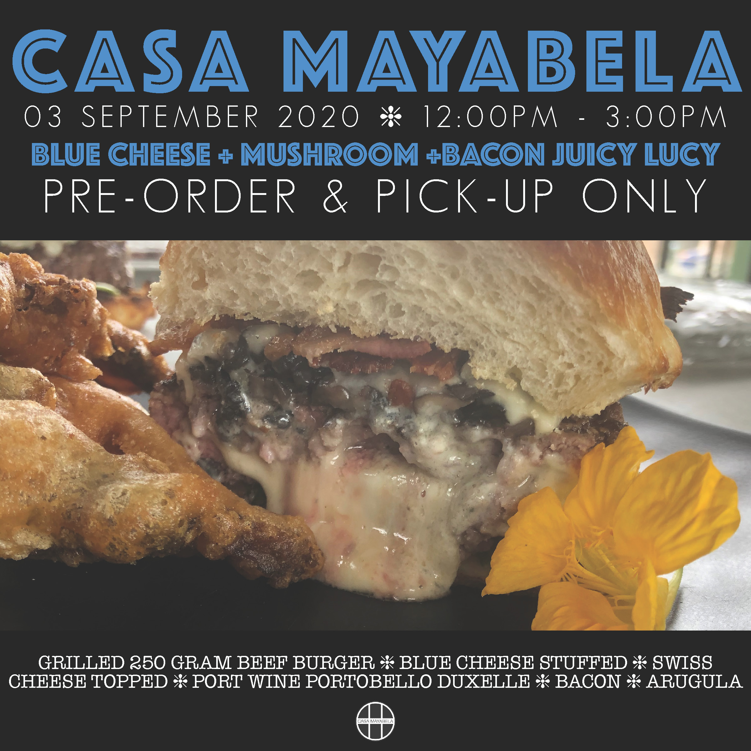 GRILLED 250 GRAM BEEF BURGER ❈ BLUE CHEESE STUFFED ❈ SWISS CHEESE TOPPED ❈ PORT WINE PORTOBELLO DUXELLE ❈ BACON ❈ ARUGULA