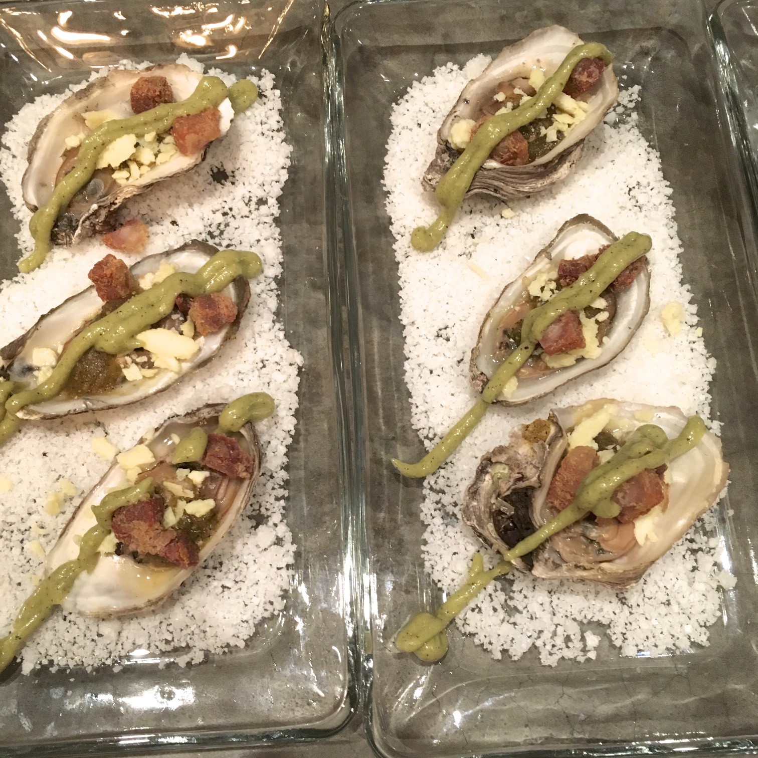 SMOKED AND GRILLED OYSTERS WITH SALSA VERDE, PORK BELLY CICHARON, COTILLA CHEESE AND AVOCADO PURÉE.
