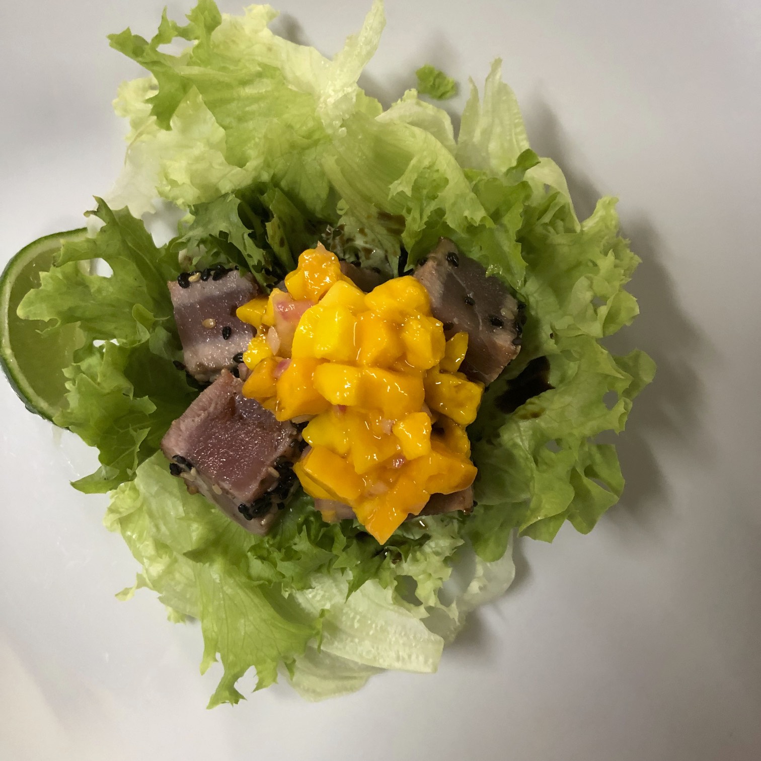 SONORAN TUNA SEARED WITH A SESAME CRUST WITH MANGO RED PEPPER CHUTNEY SERVED OVER AN ORGANIC GREEN SALAD WITH CRISPY EGG NOODLES AND A CITRUS SOY VINAIGRETTE.