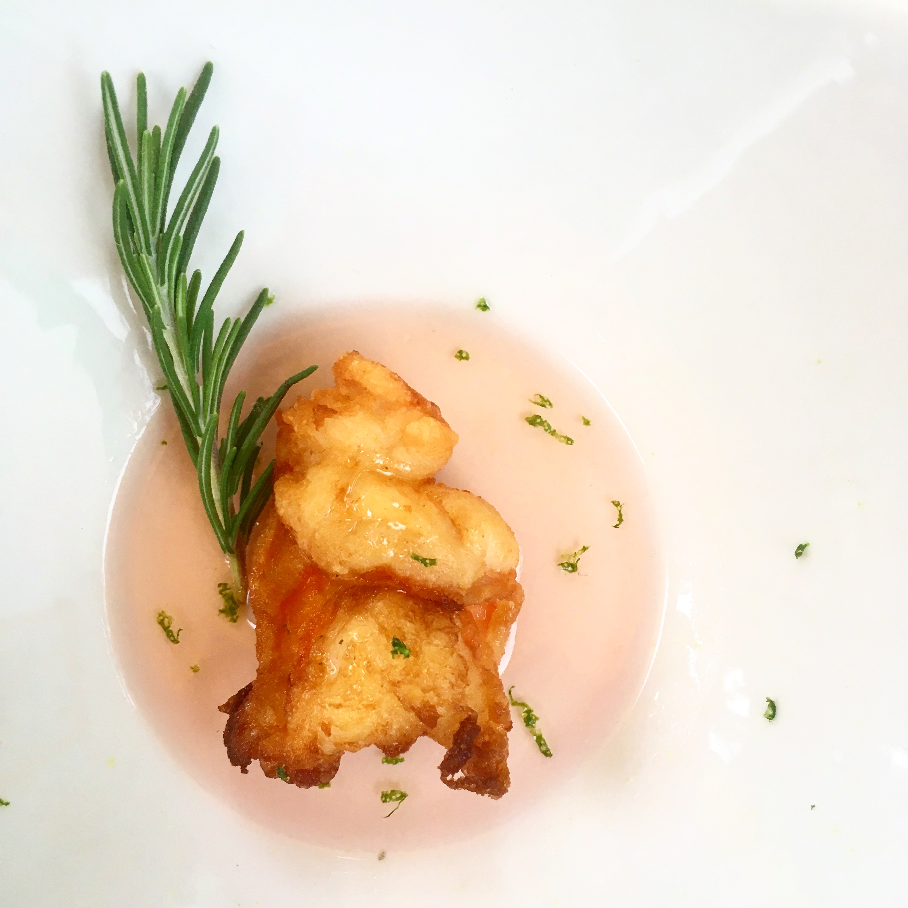 TEMPURA FRIED SHRIMP SERVED IN A BATH OF ROSE WATER AND TOPPED WITH ROSEMARY HONEY SAUCE.