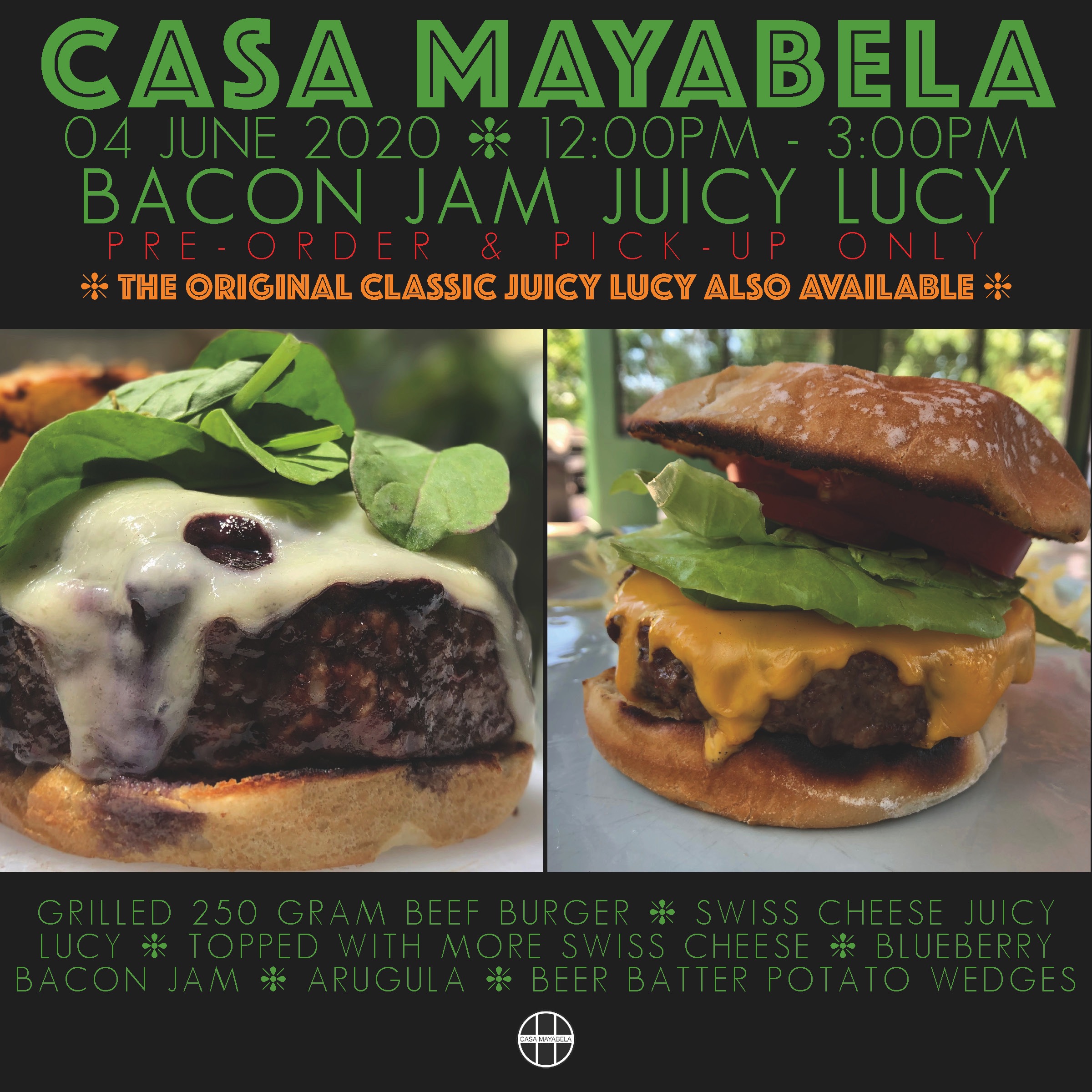 GRILLED 250 GRAM BEEF BURGER ❈ SWISS CHEESE JUICY LUCY ❈ TOPPED WITH MORE SWISS CHEESE & BLUEBERRY BACON JAM ❈ ARUGULA ❈BEER BATTER POTATO WEDGES❈200 pesos
