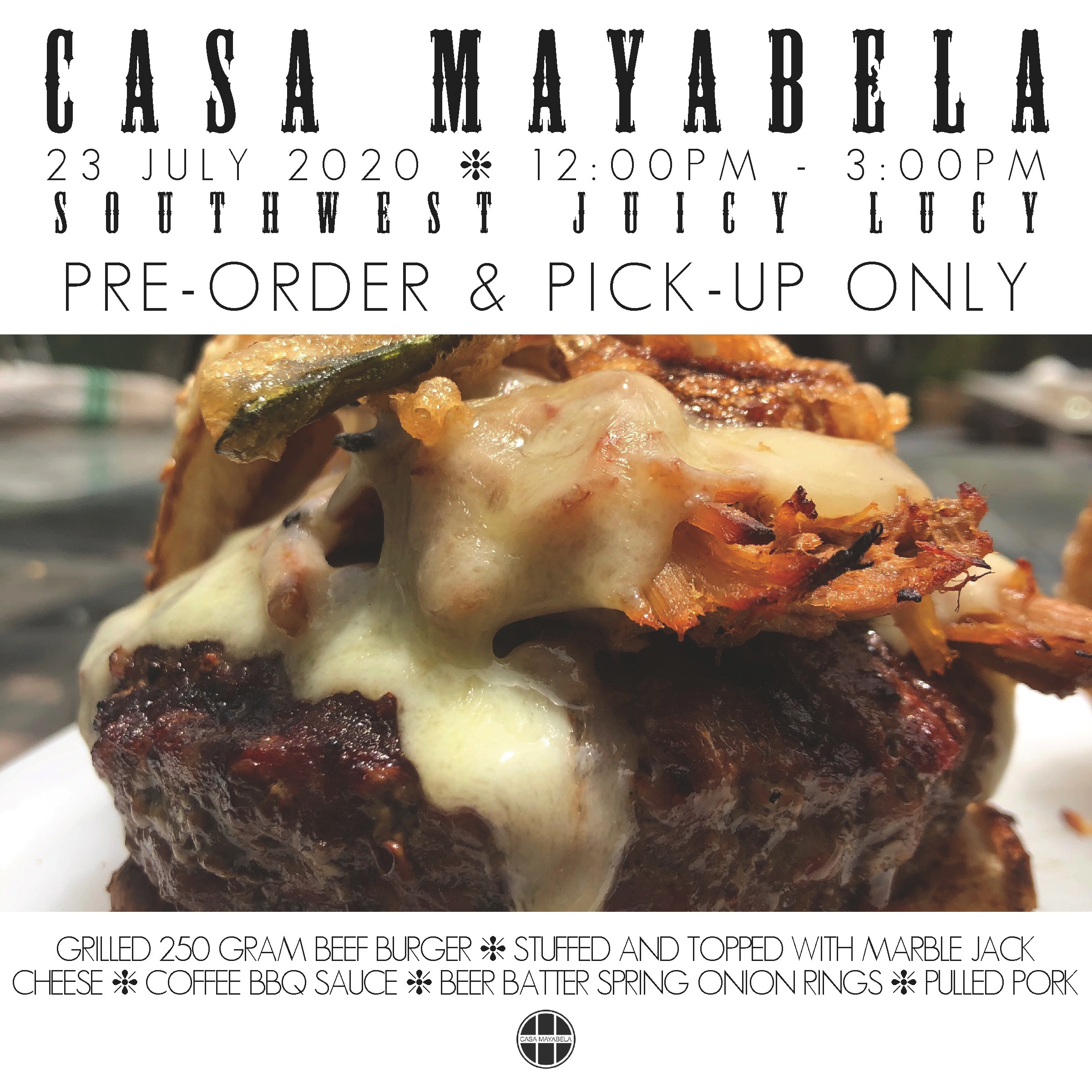 GRILLED 250 GRAM BEEF BURGER ❈ STUFFED AND TOPPED WITH MARBLE JACK CHEESE ❈ COFFEE BBQ SAUCE ❈ BEER BATTER SPRING ONION RINGS ❈ PULLED PORK